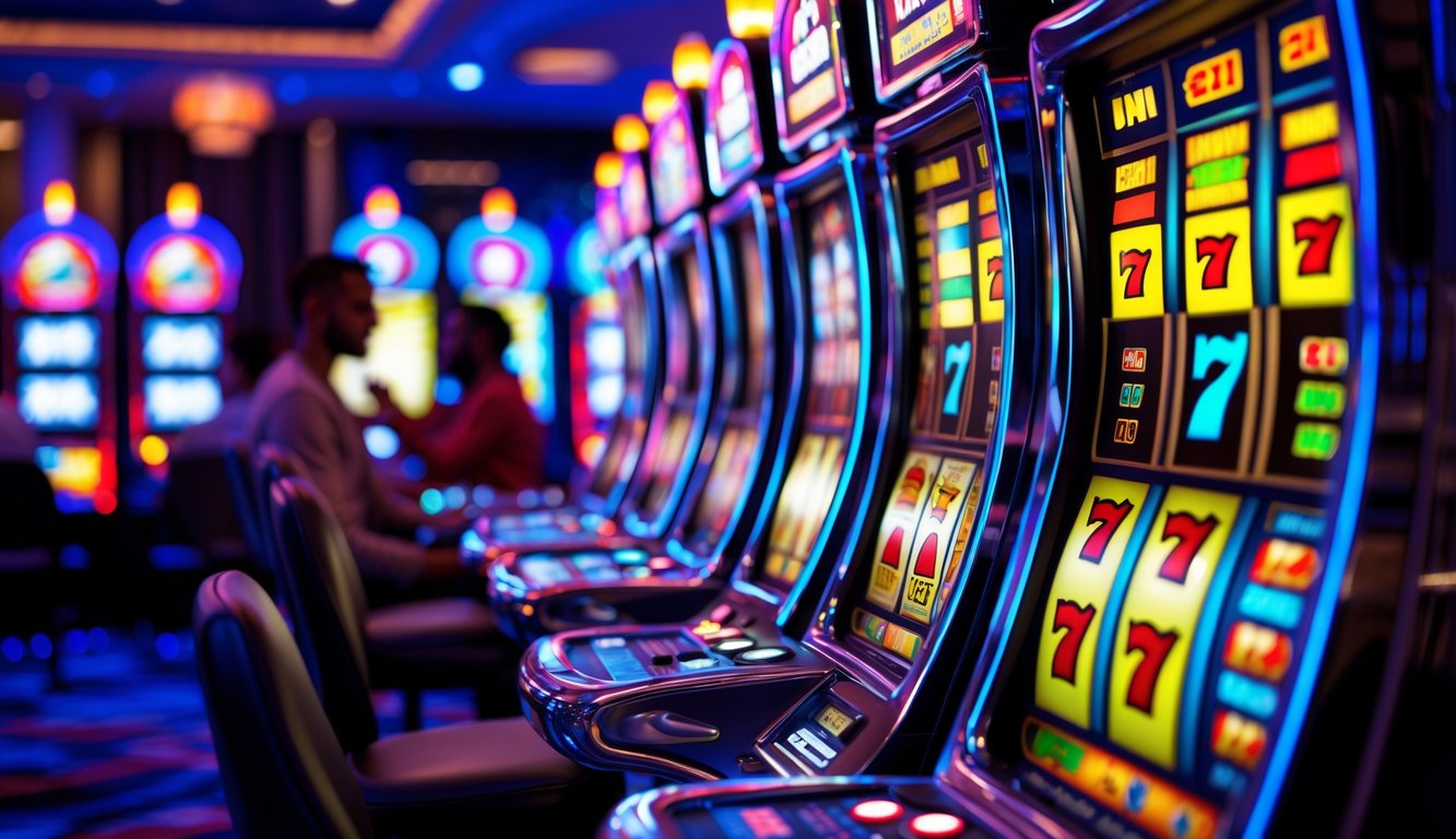 Suasana kasino dengan mesin slot berwarna-warni yang menyala dan pemain yang sedang bermain.