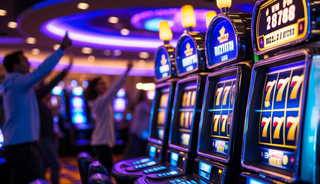 Area mesin slot kasino modern dengan mesin slot yang menunjukkan kombinasi kemenangan dan pemain yang sedang merayakan.